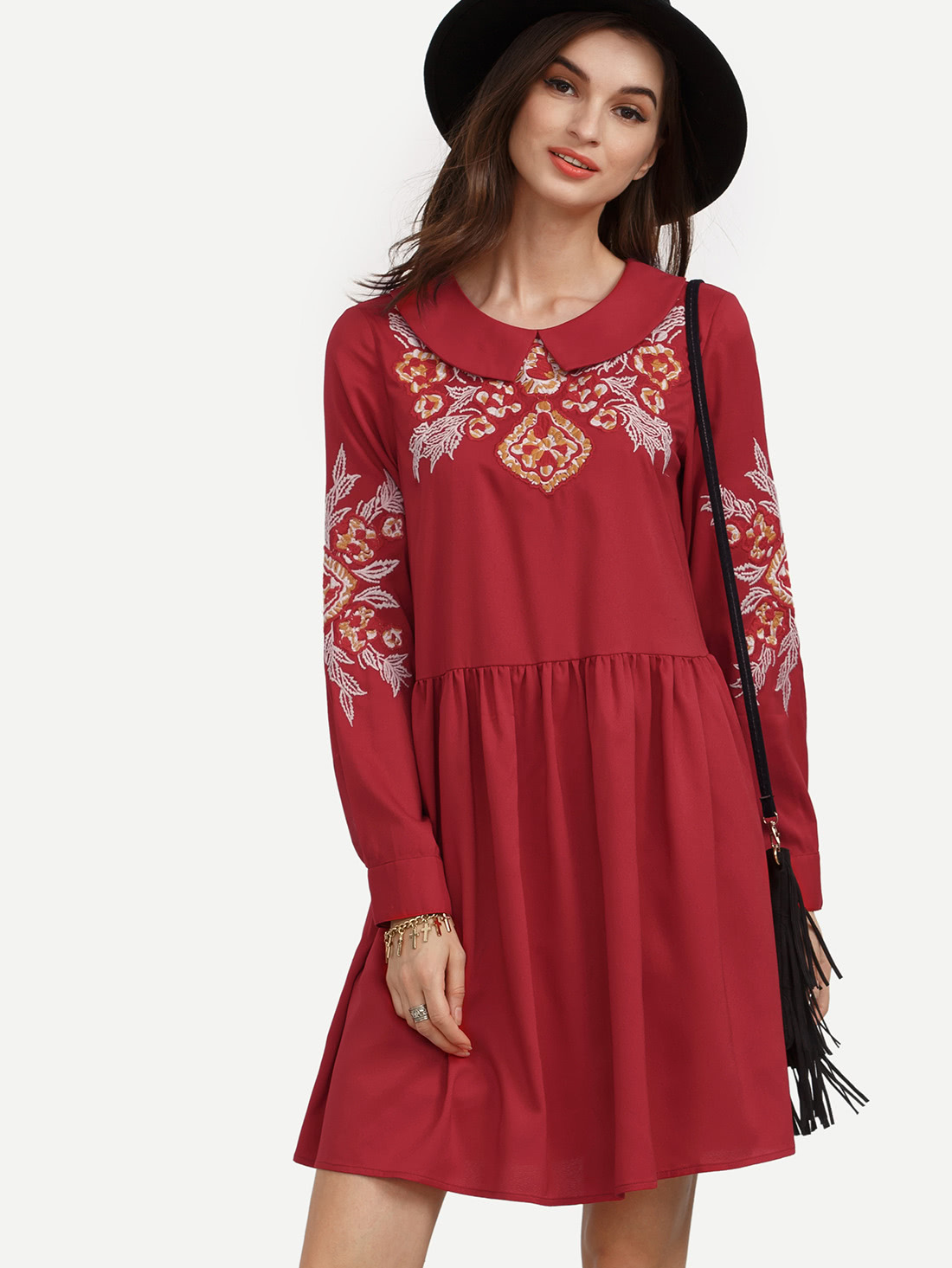 Red Crew Neck Floral Embroidered Dress Discounted at only: US$ 29.69