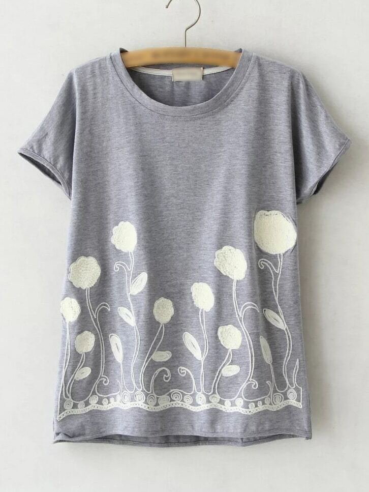 Grey Round Neck Dandelion Embroidery T-shirt Discounted at only: US$ 13.99