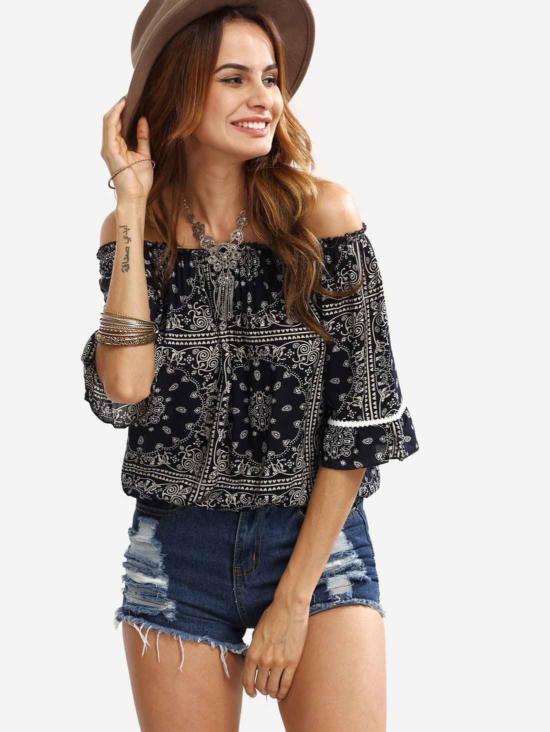 Off-The-Shoulder Tribal Print Top - Navy Discounted at only: US$ 14.99