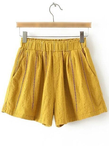 Yellow Pockets Elastic Waist Hollow Embroidery Shorts Discounted at only: US$ 27.99