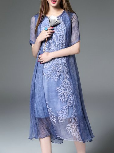 Blue Crew Neck Half Sleeve Paneled A-line Midi Dress Discounted at only: US$ 118.00