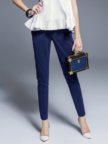 Navy Blue Plain Work Polyester Buttoned Skinny Leg Pants Discounted at only: US$ 47.00