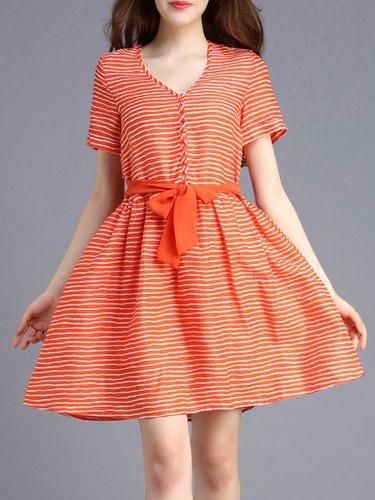 Orange Skater V Neck Stripes Sweet Mini Dress Discounted at only: US$ 73.00