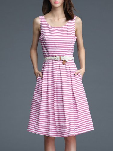 Pink Crew Neck Pockets Sleeveless Stripes Midi Dress