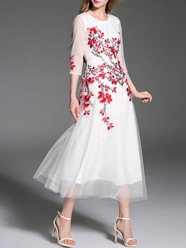 White Floral-embroidered Crew Neck Cotton 3/4 Sleeve Midi Dress